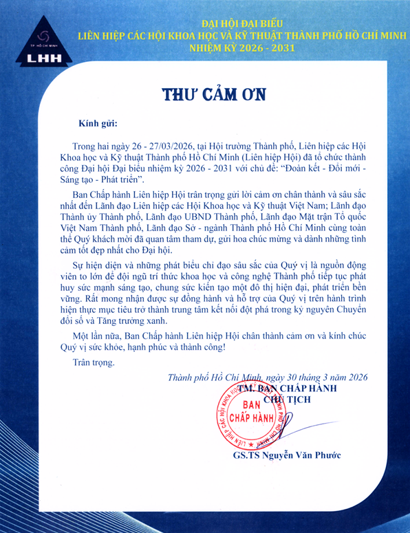 (LHH – TP.HCM) – Trong hai ngày 26 – 27/03/2026, tại Hội trường Thành phố, Liên hiệp các Hội Khoa học và Kỹ thuật Thành phố Hồ Chí Minh (Liên hiệp Hội) đã tổ chức thành công Đại hội Đại biểu nhiệm kỳ 2026 – 2031 với chủ đề: “Đoàn kết – Đổi mới – Sáng tạo – Phát triển”.
